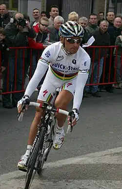 Bettini at the 2007 E3 Harelbeke wearing the rainbow jersey