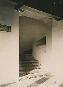 The rear of the New and Old Palaces had an L-shaped double-height open gallery, supported by 32 Ionic stone columns, facing onto the courtyard. At the central corner of the gallery the Old Palace's semi-exterior staircase emerged at the upper level, having risen from the ground floor at the rear of the New Palace.[2][7] The gallery gave its name to the central courtyard which became known as el patio de las galerías.[15]