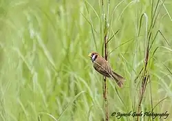 The bird is more or less brown all over, with an extensive black area on upper breast and uniform rufous-buff remainder of underparts. The similar spot-breasted parrotbill, a close relative, has arrow-shaped spotting on breast and pale buff underparts. The voice is a gruff howh, jeehw or jahw, the song a rhythmic series, aw jahw jahw jahw and uhwi uhwi uhwi uhwi. Alternatively, a higher-pitched wi chi'chi'chi'chi'chi, wi yi'yi'yi'yi'yi; wi'uwi-uwi-uwi wi chu-chu-chu is given.[3]