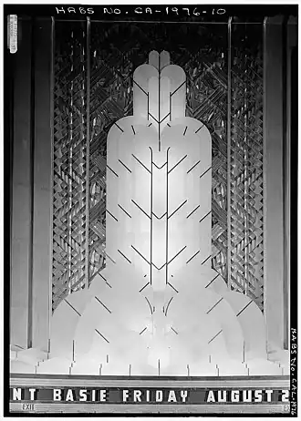 The Paramount Theatre was built as a movie palace, during the rise of the motion picture industry in the late 1920s. In 1925, Adolph Zukor's Paramount Publix Corporation, the theater division of Paramount Pictures, one of the great studio-theater chains, began a construction program resulting in some of the finest theaters built. Publix assigned the design of the Oakland Paramount to 38-year-old San Francisco architect Timothy L. Pflueger (1892–1946) of Miller and Pflueger. The Paramount opened at a cost of $3 million on December 16, 1931.[6] Pflueger was also the designer of the Castro Theatre in San Francisco. The Art Deco design referred to the 1925 Exposition Internationale des Arts Décoratifs et Industriels Modernes in Paris.[7] The term Art Deco has been used only since the late 1960s, when there was a revival of interest in the art and fashion of the early 20th century.[8]