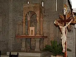 In the eastern wall, there are three apses, a central major one, where the altar is now located, and two minor ones on either side. The western area is lit by the three single-lancet windows in the major apse and the two inserted in each of the minor ones. Next to the north-facing wall is a sculpture of the Madonna surrounded by four saints, in Gothic style and made of stucco. In the center of the major apse is a small door leading to the niche where the chrism for baptisms is kept, while to its left is a small late Gothic tabernacle.[21]