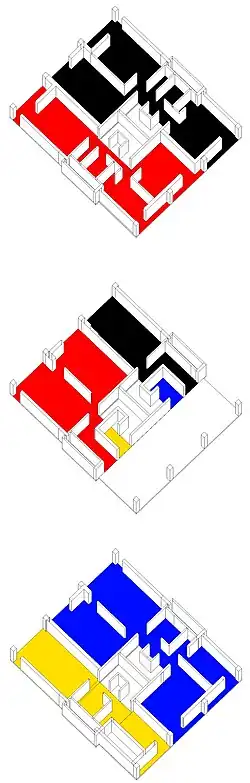 The horizontal design repeated itself every three bays: each of these units contained a one bedroom flat (yellow), a two bedroom flat (blue), a two bedroom maisonette (black) and a three bedroom maisonette (red). The levels are connected by the H-frame containing the stair columns.