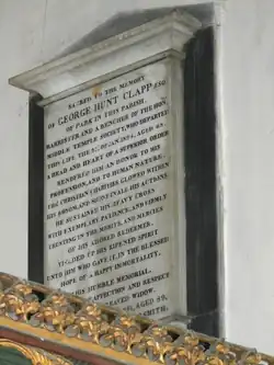 It was the seat of George Hunt Clapp (1756-1824), a barrister and a bencher of the Middle Temple, and in 1798 a governor for life of the Magdalen Hospital in London.[14] His inscribed mural monument survives in Bovey Tracey Church. His origins are revealed by the will of his grandfather George Hunt (d.1768) of Northwick, signed 31 October 1766. He leaves all his freehold lands and tenements in the parishes of North Bovey and Throwleigh, immediately upon his own decease, to "my grandson George Luxton, son of Thomas Luxton and Elizabeth his wife, my daughter, of Winkleigh, Esq.," with remainders to " my granddaughter Elizabeth Luxton, sister of the said G. L.," and "my granddaughter Mary Luxton, younger sister of the said G. L." He leaves Tarr Mill in S. T., immediately after his decease, to "my grandson George Hunt Clapp, son of Robert Clapp and Mary his wife, my youngest daughter, of Ottery St. Mary, gent.," with remainders to " my grandson Francis Hunt Clapp," and others.[15]