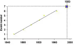 Because of the regularity of large events (mb>5.5) at the Parkfield location (events in 1857, 1881, 1901, 1922, 1934, and 1966), and the fact that the waveforms from many of these events were almost identical, it was believed that the same segment of fault ruptured each time. This led to the prediction in 1984 of a similar event in 1993.[4]