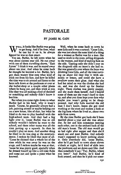 Cain’s first published short story, "Pastorale” is distinguished from his earlier dialogues and sketches he had produced for The American Mercury since 1924.[4] The story describes a gruesome small-town murder of an elderly married man by two local men, one of whom wishes to marry his young wife.[5]