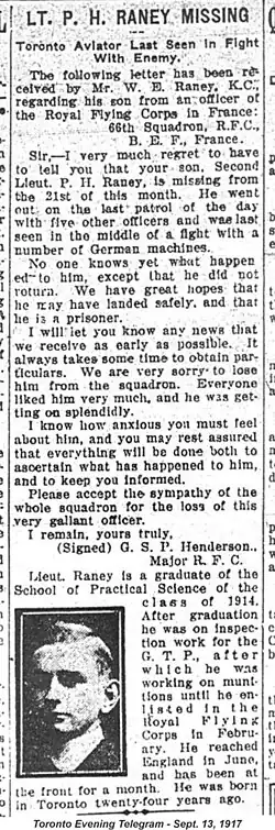 A photo of Raney and O'Brien was found on Raney's body, and given to O'Brien by the Germans. When Raney did not return from his patrol, a letter was dispatched two days later to his family in Canada, stating that he had gone missing. A very short note was later dropped over the British lines by the Germans, addressed from Patrick O'Brien to his commanding officer, stating simply "Paul Raney killed." This information was taken as official soon after O'Brien escaped from Courtnai prison in Belgium, and returned to Canada. O'Brien visited Raney's parents in Toronto to inform them of what he knew, and to bring them a map of his grave. He preserved this map through a difficult escape which included swimming through canals. This map is no longer extant. Regardless of its ultimate fate, ground fighting (and shelling) over the same territory (near Roeselare, Belgium) in 1918 would have rendered nearly any map or grave marker largely useless. Subsequent attempts by the War Graves Commission (after repeated appeals by his father to them) failed to locate any trace of Raney's remains or final resting place, which remains unknown.