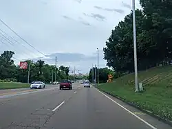 The parkway saw additional growth in commercial development in the early 2010s and from the late 2010s to the early 2020s.[41][42] These developments resulted in additional traffic congestion and hazards on the parkway, and further criticisms from motorists. By 2018, the crash rate on parts of the parkway was five times greater than that of the area, prompting the city to begin preliminary plans for safety improvements to the corridor.[43] In October 2019, the first blank-out sign in Cleveland, which restricts right turns on red when illuminated, was installed at the intersection of Paul Huff Parkway and Peerless Road.[44] On October 14, 2021, TDOT broke ground on a widening project on the connecting section of SR 60, which will include the construction of additional turn lanes at the intersection with the parkway.[45][46] In early 2022, the city announced that a total of nine improvement projects were planned for the parkway.[47] The first project, which took place from June 2022 to November 2023, expanded the Mouse Creek Road intersection by adding turn lanes to both routes and through lanes to the latter road.[48] The next project, which began in January 2024 and is expected to be complete eight months later, includes improvements to both intersections with the I-75 ramps.[49][50] Additional projects will include improvements to the intersections with Peerless Road and Frontage Road/Adkisson Drive, and the section between the latter intersection and I-75.[51][52]
