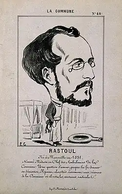 Paul Philémon Rastoul (1 October 1835; Thézan-lès-Béziers, Hérault - 1875) was a French physician best known for his role in the Paris Commune of 1871.[1] Rastoul studied medicine in Montpellier from 1855 to 1862 and moved to Paris in 1863 where he began practicing.[1][2] During the Paris Commune, Rastoul was elected to represent the 10th arrondissement at the Communal Council.[1] He was put in charge of medical services in Paris.[1] After the Commune, Rastoul was arrested and imprisoned in France before being deported to New Caledonia in 1873 where he was allowed to practice medicine and partially recover his liberty. Following the 1874 escape of a group including Henri Rochefort, Rastoul was sent to the Isle of Pines. In March 1875, Rastoul and nineteen others attempted to escape from the island on a raft but drowned.[1]