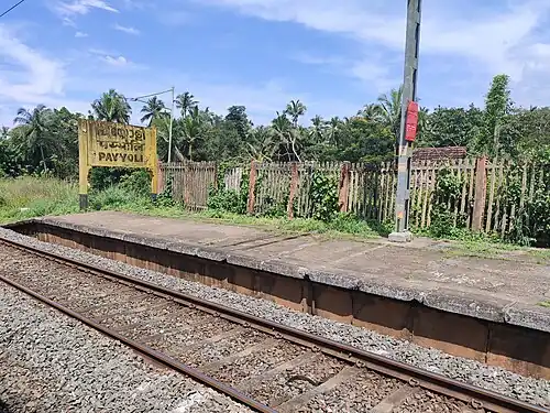 Payyoli railway station (station code: PYOL) is an NSG–6 category Indian railway station in Palakkad railway division of Southern Railway zone.[1] It is a major railway station serving the town of Payyoli in the Kozhikode District of Kerala, India. It lies in the Shoranur–Mangalore section of the Southern Railways. It is a railway station in Kozhikode district, Kerala.