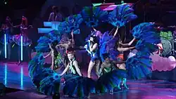 In November, Perry also performed "Peacock" at New York's Roseland Ballroom, where she introduced herself by popping out of a giant cake, dressed in a purple skin-tight cupcake print dress.[28] Additionally, Perry included "Peacock" in her setlist for her worldwide concert tour, California Dreams Tour (February 2011 – January 2012). When singing the song, the performance would include an elaborated feathered fan dance number. She wore a turquoise/green one-piece swimsuit with a peacock tail attached accompanied by female dancers dressed in a similar way, two male dancers and mimes. Concert reviewer Jim Abbott for the Orlando Sentinel felt that detailed performances such as the ones done for "Peacock" were a highlight for the singer's tour.[29]