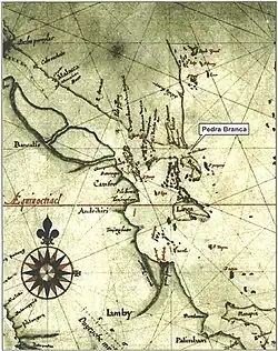 Pedra Branca was known to sailors for centuries. Part of the Chinese sailing instructions for the South China Sea based on information compiled by Admiral Zheng He (1371–1433) advised a navigator that after departing Long Ya Men (Mandarin for "Dragon's Teeth Gate"), a rocky outcrop at the gateway to what is now Keppel Harbour in Singapore, he should steer a course of between 75° and 90° for five watches until his vessel reached Baijiao.[3] Pedra Branca was also mentioned in Dutch voyager Jan Huyghen van Linschoten's Itinerario (Itinerary),[12] an account of his voyages in the Portuguese East Indies. After the publication of the work in 1596, the island began appearing regularly on European maps of the Far East.[13] The 1598 English edition of the work stated:[14]