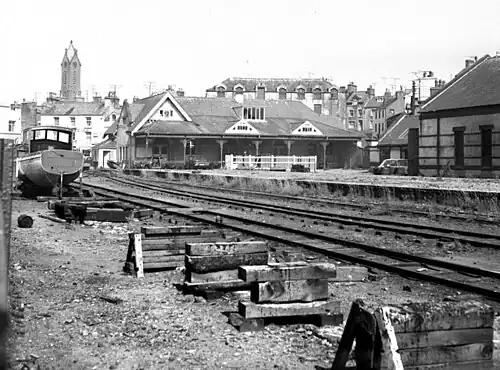 The station was built by the Isle of Man Railway and opened on 1 July 1873.[1] The station was located at the end of the railway line from Douglas via St John's to the small town of Peel. The decision to locate the station by the harbour was taken late in 1872 when the Isle of Man Railway abandoned plans to extend the line to Ramsey. The station building was located next to Peel harbour. A small goods depot was situated next to the platforms, on the side farthest from the harbour.