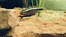 Pelvicachromis sacrimontis is a freshwater fish of the cichlid family known only from a small area of southeastern Nigeria. Currently Fishbase considers this binomial to be a junior synonym of P. pulcher[1] and, it was also known as Pelvicachromis camerunensis, P. pulcher "form B" or P. sp. aff. pulcher but some authorities now consider it to be a valid species.[2] It is occasionally available in the tropical fish trade as "giant krib" and there are three colour morphs – red, green and yellow. And are the most colorful of the Pelvicachromis family. Today its popularity increases due to more order demands by aquarium hobbyists.