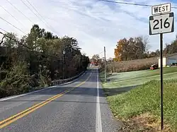 When Pennsylvania first legislated routes in 1911, what is now PA 216 was not given a number.[4] PA 216 was designated in 1928 to run from PA 116 east of Hanover east and north to US 30 west of York, following its current alignment east to Glen Rock before it turned north and ran through Seven Valleys before reaching US 30. At this time, the route was paved between PA 116 and west of Glenville, between east of Glenville and Glen Rock, and between Seven Valleys and US 30.[5] In 1930, PA 216 was realigned to head east from Glen Rock to US 111 (Susquehanna Trail) south of Loganville, with PA 616 designated onto the former alignment between Glen Rock and US 30. At this time, the entire length of PA 216 was paved.[6] By 1940, Seaks Run Road was an unpaved road while Swamp Road was a paved road.[7] Seaks Run Road was paved in the 1940s.[8] PA 216 was extended east to an interchange with I-83/US 111 in 1960.[9] The route was extended east from I-83 to PA 24 in Winterstown in 1961 in order to provide a numbered route at the interchange with I-83.[10]