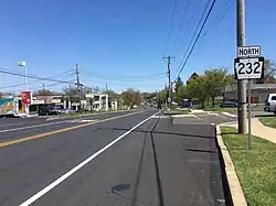After this intersection, the road narrows back to two lanes and turns northeast into residential areas, reaching a junction with Maple Avenue.[4] PA 232 makes a curve to the north as it crosses Bristol Road into Northampton Township.[7] The route turns northeast again and continues past more housing developments with a few businesses.[4] At Richboro, the road crosses Ironworks Creek and passes shopping centers and businesses as Bustleton Pike merges into Second Street Pike and PA 232 continues due north. The route widens to four lanes and passes more commercial development as it crosses PA 332 (Almshouse Road/Newtown Richboro Road).[4][7] Following the PA 332 junction, the road narrows to two lanes and passes more residential areas, with Worthington Mill Road branching to the northeast.[4] As the route approaches the Sacketts Ford Road intersection, the settings become more rural as the road passes near farms and woods with some homes.[4][7]