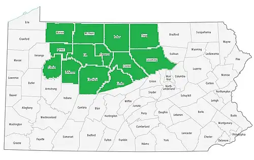 The Pennsylvania Wilds comprises all of the following 12 counties: Warren, McKean, Potter, Tioga, Lycoming, Clinton, Elk, Cameron, Forest, Clearfield, Clarion, Jefferson, and the northwestern part of Centre county.[7]