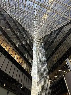 The connecting atrium at ground level serves as a shared lobby and public gathering space. The glass roof and surrounding reflective surfaces enhance the sense of openness and fluidity, a stark contrast to the typical hermetic skyscrapers of the era. The ceiling creates an engaging and interactive experience, filling the lobby with sunlight and acting as a large-scale skylight. The two buildings never interlock, instead creating a pseudo hallway between their facades in the plaza.[2][14][15]