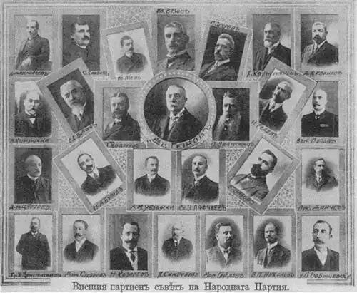 The People's Party, also rendered as National or Nationalist Party (Bulgarian: Народна партия, romanized: Narodna partiya, NP, or Narodnyatsite, "Populists"), was a political group in Bulgaria, active between 1894 and 1920—during the country's existence as an autonomous principality and independent kingdom. A paternalistic-conservative force challenging and replacing the People's Liberal Party, it was founded and led until 1901 by Konstantin Stoilov, and thereafter by Ivan Evstratiev Geshov. First organizing in Ruse as an outgrowth of the Svobodno Slovo alliance, it traced its more distant origins to the Conservative Party, which had functioned in Bulgaria-proper during the early 1880s, and to the People's Party of Eastern Rumelia. All these groups were tightly oligarchic, alternating between a public embrace of liberal conservatism and a more ingrained commitment to paternalistic conservatism; beyond this, they supported a moderate version of Bulgarian nationalism, and had a foreign policy that was primarily centered on Russophilia. Unlike other Russophilic parties, the NP advocated for tight relations with Romania.