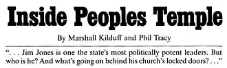 - ^ Kilduff, Marshall and Phil Tracy. "Inside Peoples Temple." Alternative Considerations of Jonestown and Peoples Temple. Jonestown Project: San Diego State University. August 1, 1977. "Jonestown". Archived from the original on December 17, 2010. Retrieved 2006-10-28.