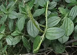 It is a moderately small, ascending herb with more or less branches; stem moderate (2–3 mm) with short internodes, rusty crisp-villous; leaves alternate (exceptionally opposite), broadly elliptic or ovate-elliptic, obtuse at both ends or abruptly blunt-acuminate, moderate (1.5 x 2.2 x 4 cm), 5-nerved, appreassed–hairy on both faces, grandular beneath; petiole very short (2 mm.), hairy; spkies terminal and axillary, 2 x 60 mm. somewhat loosely subverticiliately flowered; peduncle approximately 10 mm. long, from sparsely crisp–pubescent glabrescent; bracts round-peltate; ovary impressed, ovoid, obtuse; stigma subspical.[4]