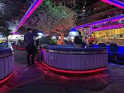 The Peppermill is noted for its retro 1970s appearance.[22][23][24] The interior features a blue and purple color scheme,[25][26][27] as well as neon lights, fake vegetation, and mirrored ceilings.[8][28] Tiffany lamps are hung above the tables and feature a flamingo design.[6][29]