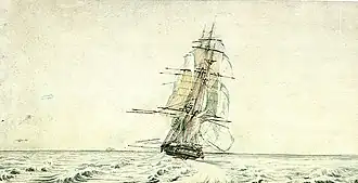 By 1817 Doris had returned to England, where she received a repair at Sheerness between October 1817 and April 1818. She was fitted for sea between March and June 1821, having been recommissioned in March by Captain Thomas Graham. The frigate joined the South America Station, where Graham died in April 1822.[24] He was replaced by Captain Frederick Vernon, who in turn handed over to Captain William Hope Johnstone in 1824.[35] Doris was paid off in January 1825, but recommissioned a month later under Captain Sir John Sinclair. Sinclair commanded the frigate until 1829, when in April she was sold at Valparaiso for $5,590 because of her poor condition.[36]