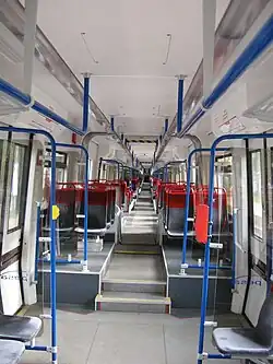 The passenger area has a 2+2 seating arrangement with upholstered seats, except in the middle parts of the end cars where the seats are positioned along the windows.[12] The low-floor section of the first car has two bicycle holders, while the low-floor section of the last car has space for larger luggage and one spot for a disabled person, next to which ramps are installed. The interior is equipped with CCTV, forced-air and electric convective heating, visual and auditory passenger information systems, and ticket validators.[23] In early 2007, air conditioning was added,[12] and during the modernization between 2014 and 2015, Wi-Fi was installed.[32] The vehicle does not have toilets.[1]