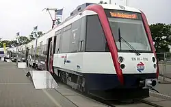 The EN95-01 unit commenced operations on 1 September 2004,[12] serving one of the 10 routes operated by the Warsaw Commuter Railway at that time.[21] From September 20 to 24, the unit was loaned to the manufacturer for display at the InnoTrans trade fair in Berlin.[34] Initially, the vehicle experienced various malfunctions, including current collector[35] and compressor failures,[12] as well as wiring issues,[36] resulting in less frequent operation. These defects were repaired by the manufacturer under warranty.[37]