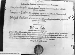 Šarić wanted to secure the state stipend for Čule.[19][20] Although his grades were satisfactory, Čule also needed confirmation on the property status of his parents.[20] However, the bishop of Mostar-Duvno Alojzije Mišić intended to appoint him a parish priest in Blagaj, from where he expelled a local Franciscan for disorderly conduct and couldn't replace him with another Franciscan due to the opposition from the locals. The Provincial of the Herzegovinian Franciscans asked Mišić to find a diocesan priest.[19][21] Čule was supposed to take the post on 8 September 1921—this endangered Čule's intention to continue his education.[22] However, the Provincial changed his mind and proposed Mišić yet another Franciscan for the duty.[19] Mišić agreed to drop the appointment but still insisted on keeping Čule as a parish priest or a chaplain. Nevertheless, Čule asked the bishop to send him for further education.[19][21] The time for the stipend already expired.[21] However, the rector of the Catholic Faculty of Theology in Sarajevo Antun Prešern managed to arrange a place for Čule at the Jesuit Collegium Canisianum in Innsbruck, Austria.[19][21] As he didn't manage to secure the stipend, Čule managed his financing by himself.[19] At the end of September 1921, Čule was in Innsbruck. The study system was the same as in Sarajevo, which suited Čule.[21] On 12 July 1912, Čule defended his doctoral thesis titled De statu hominis of St. Bonaventure and was given the title of doctor of theology. He finished his studied in Innsbruck with summa cum laude.[19][21]
