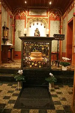 He had a bad lung condition since 1843 and each winter since 1857 could no longer visit other houses of the order outside of Koblenz. But he contracted serious tuberculosis around 1853 and it rapidly progressed.[2][1] Friedhofen died in the early hours of 21 December 1860 in Koblenz after six weeks of being bedridden due to tuberculosis and was buried at the main cemetery of Koblenz.[2] His remains were transferred on 27 July 1928 to the order's motherhouse at Trier, where he was buried in the so called Maria-Hilf-Kapelle, formerly at Koblenz (where Friedhofen often went and prayed in order to get helph from the Holy Virgin) and translocated to Trier.[1]