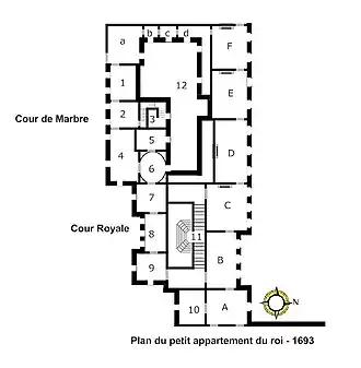 a-ha) cabinet de perruques; b) cabinet particulier du roi; c) cabinet de la chaise; d) staircase; e) cabinet-doré; f) corridor; g) salle des bains; h) salle des cuves