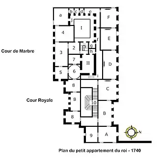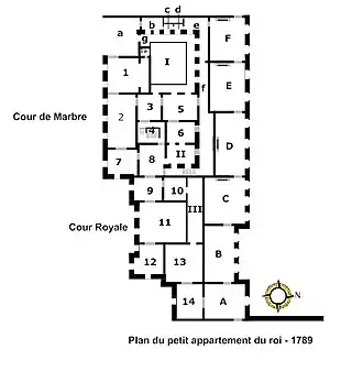 The petit appartement du roi (French: [pɛtit‿apaʁtmɑ̃ dy ʁwa]) of the Palace of Versailles is a suite of rooms used by Louis XIV, Louis XV, and Louis XVI. Located on the first floor of the palace, the rooms are found in the oldest part of the palace dating from the reign of Louis XIII. Under Louis XIV, these rooms housed the King's collections of artworks and books, forming a museum of sorts. Under Louis XV and Louis XVI, the rooms were modified to accommodate private living quarters. At this time, the rooms were transformed and their decoration represent some of the finest extant examples of the Louis XV style and Louis XVI style at Versailles (Kimball, 1943).