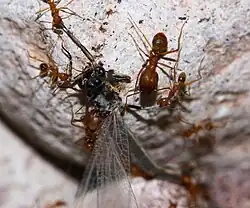 Pheidole vistana is a species of big-headed ant native to Nevada, Arizona, California, Baja California, Baja California Sur, and Sonora.[1][2][3][4][5] Its diet apparently consists of only insects, and many workers will cooperate to efficiently transport prey into the nest. It is a primarily nocturnal species that may rarely forage on overcast days. Large rings of sand often surround its nest entrances.[6]