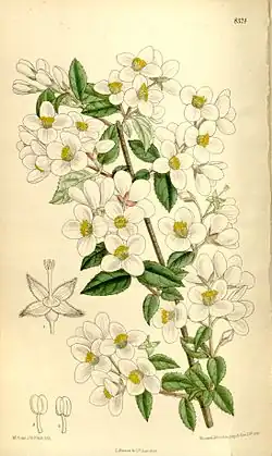 Philadelphus delavayi is a deciduous shrub in the genus Philadelphus, native to China, Tibet, and Upper Burma. It was discovered by Pierre Jean Marie Delavay in 1887. It has an upright growth habit, to a height of 3 metres, with arching branches and ovate, tapered, sometimes toothed, dark green leaves up to 10 cm or more long. It bears racemes of 5-9 cup shaped, single, very fragrant creamy-white flowers, 2.5 cm across.