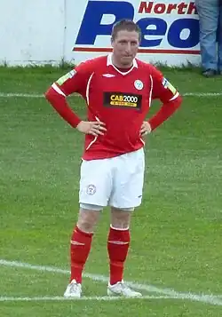 Hughes' next destination was First Division Monaghan United for the 2005 season.[8] He scored eight goals in 25 appearances that season for Monaghan United before joining his former manager at Kilkenny, Kildare and Dublin City, John Gill at First Division promotion chasing Dundalk. Hughes made his Dundalk debut on the first day of the 2006 League of Ireland First Division season in a 2–1 defeat away to Shamrock Rovers at Tolka Park on 10 March 2006.[9] He went on to score 21 goals that season for Dundalk, helping them to a second-place finish and a play-off victory over Waterford United. Despite that victory, Dundalk did not achieve promotion as they failed to qualify on criteria for the FAI's revamped Premier Division. Hughes' 2006 season attracted interest from several Premier Division clubs including Bohemians, but despite this interest, Hughes chose to remain at Dundalk for the 2007 First Division season. The 2007 campaign started brightly for Hughes and Dundalk as they set the pace in the First Division up to the mid-season point. Hughes lost form and struggled for fitness for the remainder of the season and his goal tally was only at six goals by the end of the season.