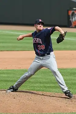 Humber spent most of the 2008 season assigned to the Twins' Triple-A affiliate, the Rochester Red Wings of the International League. He started off slowly with an 0–5 record and a 5.83 ERA in his first nine starts.[81] With Rochester, Humber eventually compiled a 10–8 record with a 4.56 ERA in 31 games (23 starts).[46] He finished with a 6–1 win–loss record and a 2.67 ERA in the second half.[82] His 4–1 win–loss record with a 2.74 ERA in August earned him the Minor League Pitcher of the Month Award.[83] The Twins promoted Humber in August 2008, and he appeared in five games for the Twins, all in relief.[84] Humber pitched 11+23 innings, and posted a 4.63 ERA and six strikeouts for the Twins.[85] Following the 2008 season, Humber was out of options, and could not be sent to the minor leagues without first being subjected to waivers, where other teams could claim him.[86]