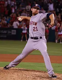 On November 30, 2012, Humber was claimed off waivers by the Houston Astros.[135] After being claimed, he signed a one-year, $800,000 contract with the Astros that included a club option for 2014.[135] Humber made the Astros' starting rotation at the start of the 2013 season.[136] Humber lost his spot in the starting rotation to Érik Bédard after opening the season with an 0–7 record and an ERA of 8.82.[137] Humber was designated for assignment on May 12, after his record fell to 0–8 with a 9.59 ERA, he cleared waivers and was sent outright to Triple-A Oklahoma City RedHawks on May 14.[138] After pitching in relief for the Oklahoma City RedHawks of the PCL, the Astros selected his contract on August 12, when they traded Wesley Wright to the Tampa Bay Rays.[139] On October 3, the Astros declined a $3 million option for 2014, instead paying him his guaranteed $500,000 and releasing him.[140]