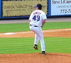 On March 8, Humber was assigned to the Mets minor league camp.[53] After rehabilitating from surgery, he resumed pitching with St. Lucie in 2006, posting 3–1 record with a 2.37 ERA in seven starts.[46][49] On July 31, 2006, a year after his surgery, Humber was once again promoted to Binghamton,[49] where he was 2–2 with a 2.88 ERA in six starts.[46] He was an early September call-up when the Major League rosters expanded on September 1.[54] However, Humber did not make his Major League Baseball debut until September 24, 2006.[55] He made two appearances for the Mets as a relief pitcher, pitching two innings.[56] However, Humber was unable to obtain his pre-surgery velocity.[40] That fall, he began play in the Arizona Fall League but his participation was discontinued when he endured shoulder tendinitis.[57]