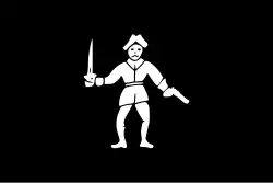 Flag (Jolly Roger) of pirate Philip Lyne, described as "a black silk flagg ... with the representation of a man in full proportion, with a cutlass in one hand and a pistol in the other, extended"