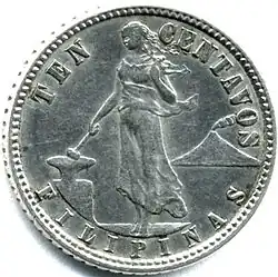 In 1903, the 10-centavo coin equivalent to US$0.05 was minted for the Philippines, weighing 2.7 grams (0.095 oz) of 0.9 fine silver. Its specifications were reduced from 1907 to 2.0 grams (0.071 oz) of 0.75 fine silver; this was minted until 1945.