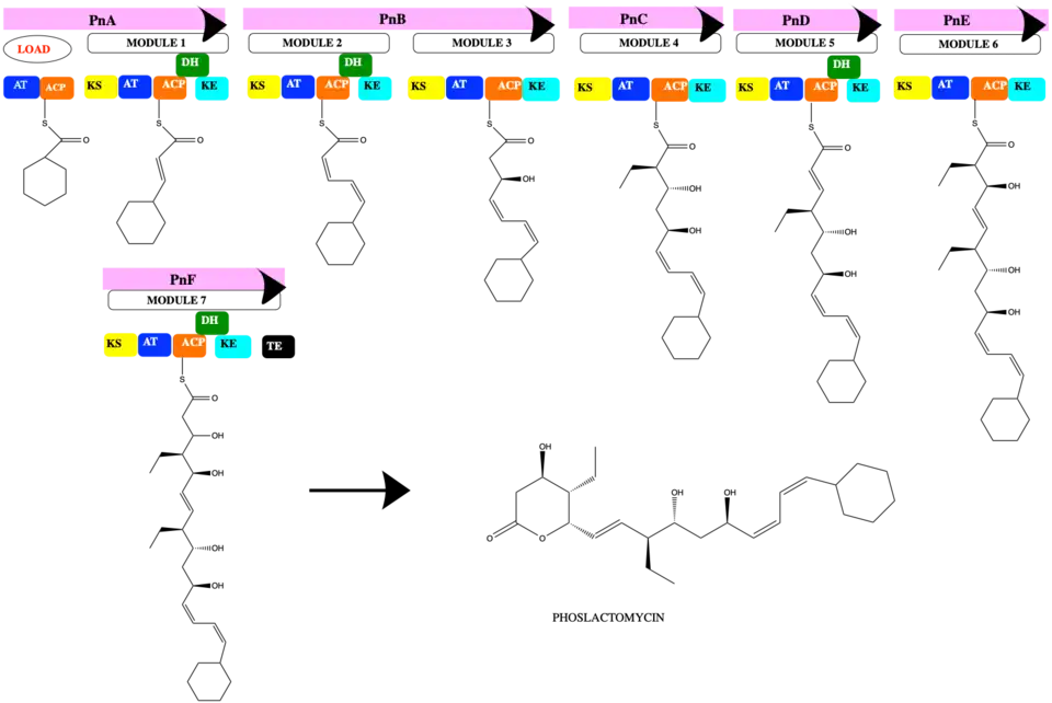 The PKS of phoslactomycin has one loading domain, 7 modules and 6 proteins that encode PnA, PnB, PnC, PnD, PnE, and PnF. The biosynthesis starts the loading with the cyclohexyl- CoA. Stepping in each module, there always need the keto synthase (KS) to create the new linkage of carbon-carbon to elongate the chain, the acyl transferase to transfer acyl to ACP domain. Then ACP serves as the acyl carrier protein to the further reaction, and each module has the keto reductase at the end to reduce the ketone to hydroxyl group with more stable. Module 1 uses the precursor malonyl-CoA and dehydrase domain to create the double bond.