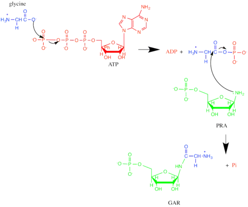 GARS operates via an ordered, sequential mechanism. 5-phospho-D-ribosylamine (PRA) binds first, then ATP, and finally glycine. Phosphate is released first, followed by ADP and GAR.[4] The oxygen in the ribose ring of PRA is important in substrate binding, likely due to favorable energetics from hydrogen bonding and the ring conformation it confers.[5] In addition, the phosphate group of GAR has been implicated in GARS substrate recognition. The reaction starts with the oxygen of glycine acting as a nucleophile to attack the γ-phosphorus of ATP. Then, the nitrogen of PRA attacks the carbonyl carbon in the intermediate, and phosphate leaves, forming GAR.[4][6]