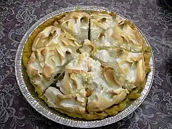 Butterscotch pie is made by cooking brown sugar with egg yolks, cornstarch, milk or cream and butter to make a butterscotch custard pie filling which is topped with meringue and browned in the oven.[15] Its invention is said to date back to 1904, credited to a creamery in Connersville, Indiana, where the recipe was published in the 1904 edition of a Methodist church cookbook.[16]