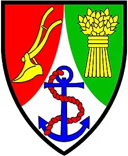Badge of Merseyside Metropolitan Council (England): On a roundel azure three mural crowns conjoined in pile [merlons outwards] or, in base two barrulets argent. -