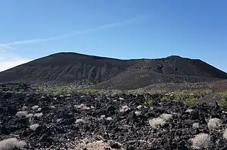 Pisgah Crater, or Pisgah Volcano, is a young volcanic cinder cone rising above a lava plain in the Mojave Desert, between Barstow and Needles, California in San Bernardino County, California. The volcanic peak is around 2.5 miles (4.0 km) south of historic U.S. Route 66-National Old Trails Highway and of Interstate 40, and west of the town of Ludlow.[2] The volcano had a historic elevation of 2,638 feet (804 m), but has been reduced to 2,545 feet (776 m) due to mining.[3]