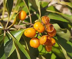 The dull yellow or orange fruit is a dehiscent 2-valved capsule containing up to 16 small red seeds aggregated into a sticky ball.[4][5][7]