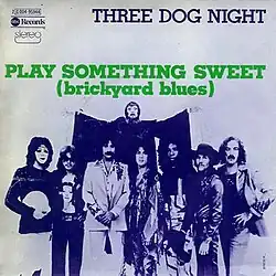 Ensuant to the August 1974 single release of the James Montgomery Band's version of "Brickyard Blues", the Three Dog Night version of "Play Something Sweet (Brickyard Blues)" was issued in September 1974 as the third single off the Hard Labor album, which had already generated the hits "The Show Must Go On" and "Sure As I'm Sittin' Here", which would prove to be respectively the group's final top ten and top thirty hits. "Play Something Sweet" became the lowest-charting Three Dog Night single since their 1968 debut disc, "Nobody", had stalled in Billboard's Bubbling Under Hot 100 ranking, the Billboard Hot 100 peak of "Play Something Sweet" being No. 33, while on the hit parade for Canada—as featured in RPM—"Play Something Sweet" was ranked at No. 25. The top 30 shortfall of "Play Something Sweet" signaled a permanent downturn in the chart fortunes of Three Dog Night, as their follow-up single had a similar mid chart impact with a Billboard Hot 100 peak of No. 32, and was the group's final Hot 100 entry.