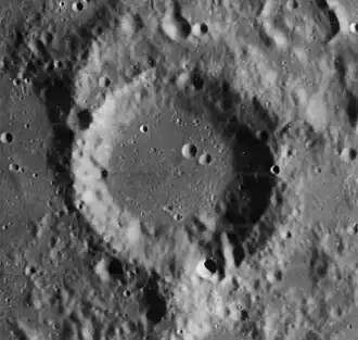 Playfair is a lunar impact crater that is located in the rugged southern highlands on the near side of the Moon. It was named after the Scottish geologist and mathematician John Playfair.[1] It lies along the eastern rim of the eroded satellite crater Playfair G, a formation that is almost twice the diameter of Playfair itself. Playfair is nearly due north of the crater Apianus, and to the southwest of the AbenezraAzophi crater pair.