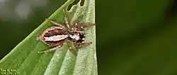 The female has a body length between 7.01 and 8.65 mm (0.28 and 0.34 in).[15] The cephalothorax measures between 3.59 and 3.91 mm (0.14 and 0.15 in) in length and typically 2.93 mm (0.12 in) in width, while the abdomen is between 3.91 and 4.56 mm (0.15 and 0.18 in) in length and typically 2.57 mm (0.10 in) in width.[16][17] The body shape and markings are similar to the male. The orange carapace has two light brown stripes similar to the male and the abdomen has a similar pattern, although lighter. The legs and spinnerets are similarly yellowish-brown. The chelicerae are orange and the spider's face, or clypeus, is yellow.[18] It has a light yellowish-brown sternum shaped like a shield, truncated to the front.[19] The epigyne is a medium-sized oval with a depression towards the front where the copulatory openings can be found. The copulatory openings lead to very coiled insemination ducts. The spermathecae are heavily sclerotised and complex with many chambers.[20]