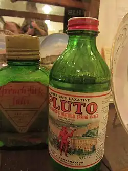 Pluto Water was a trademark for a strongly laxative natural water product which was marketed in the United States in the early 20th century. The water's laxative properties were from its high native content of mineral salts, with the active ingredient listed as sodium and magnesium sulfate, which are known as natural laxatives. The water's high native content of mineral salts generally made it effective within one hour of ingestion, a fact the company emphasized in their promotional literature. Company advertisements stated the laxative was effective from a half-hour to two hours after ingestion. In 1919, it took 450 railroad cars to transport the bottler’s output.[1]